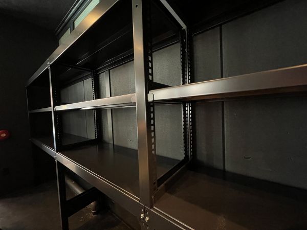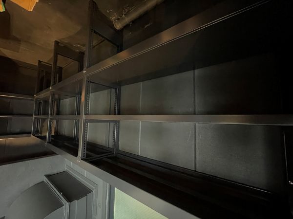 また店舗内での設置であるため、壁固定も行い、地震などで棚が倒れることが無いように施工しました。